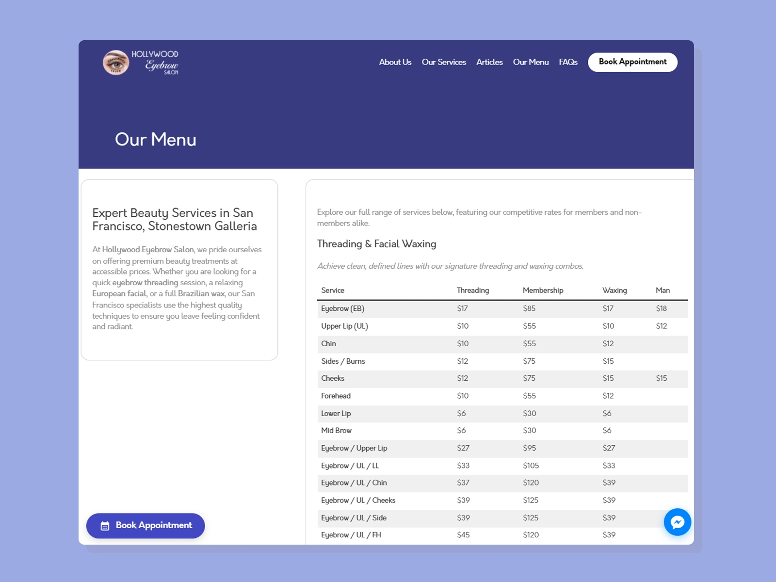 “Before & After” Visual Proof: Specialized galleries designed to show off your threading and waxing results without slowing down your site.